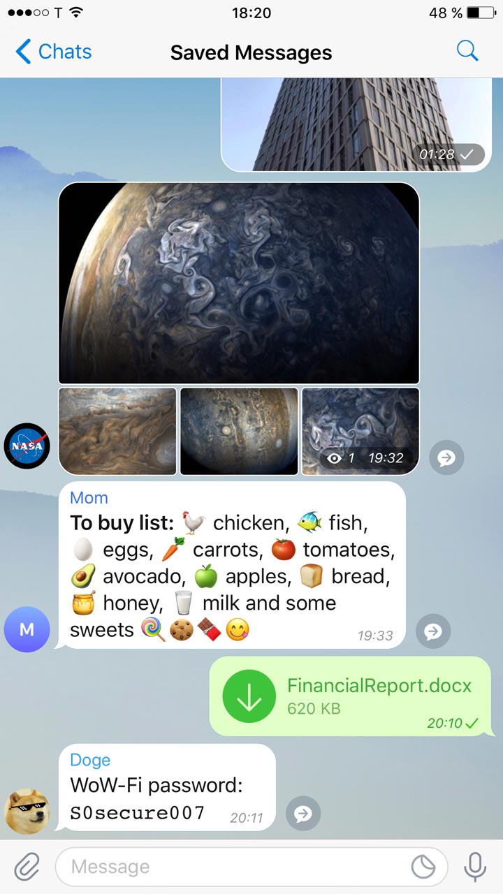 You can now bookmark important messages by quickly forwarding them to Saved Messages – your personal cloud storage for any messages or media you may want to send or forward there. Each saved message has a “go to” button that takes you to the right place in the chat where it was originally posted.
