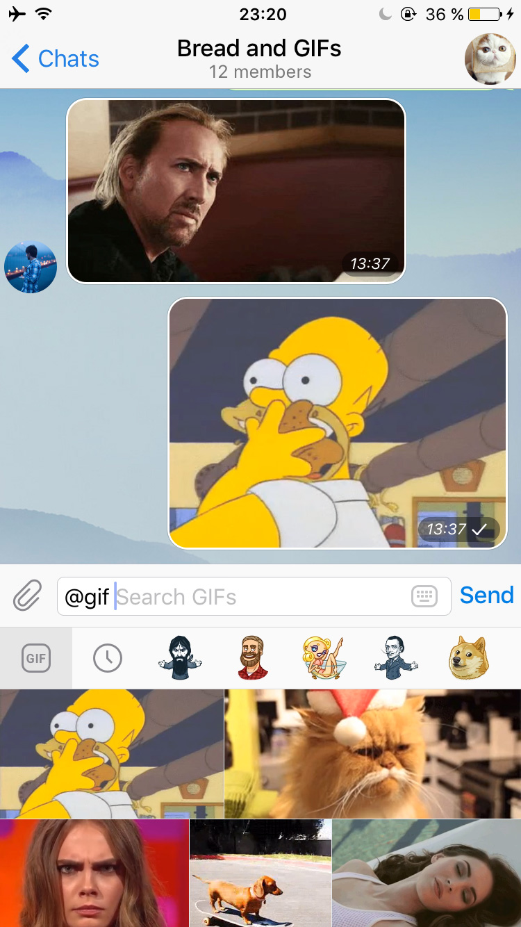 Last but not least, our new Inline Bots feature offers another innovative way of finding and sharing GIFs. These bots deserve a separate blog post.