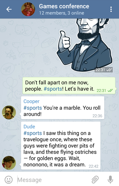 Another new way of bringing structure to group chats is by using hashtags. Any word starting with a “#” will be clickable. Tap on a hashtag to get instant search results from your Telegram messages.