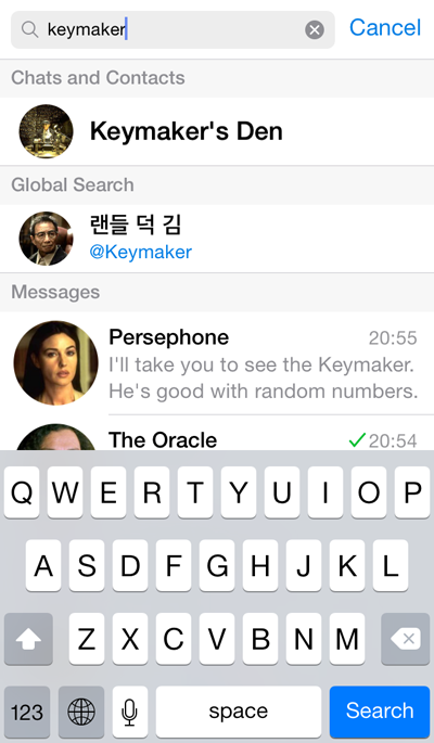 Instead of looking for the right search box, just type your query in the new universal search field and get instant results — contacts, chats, groups, usernames or messages.